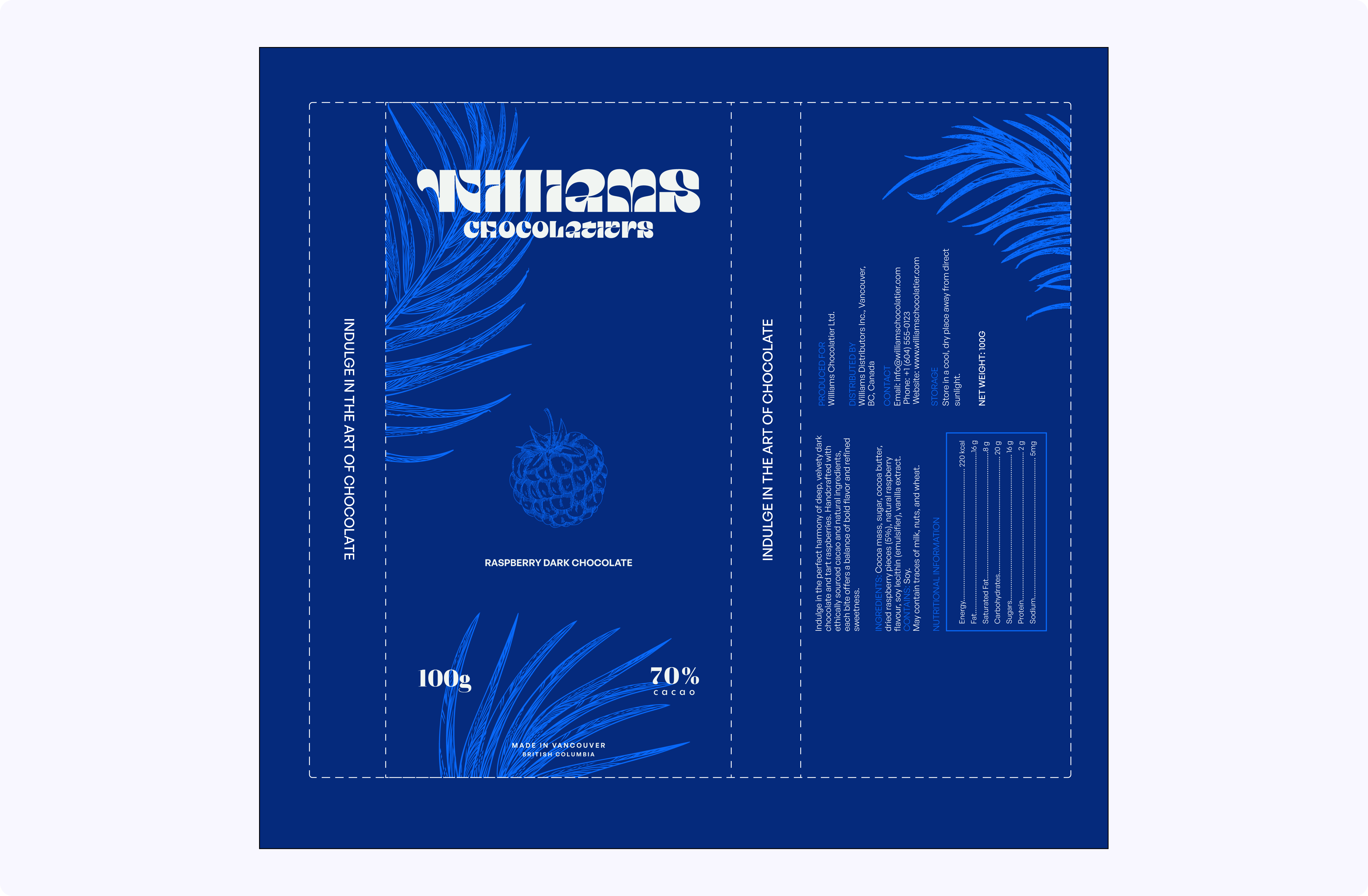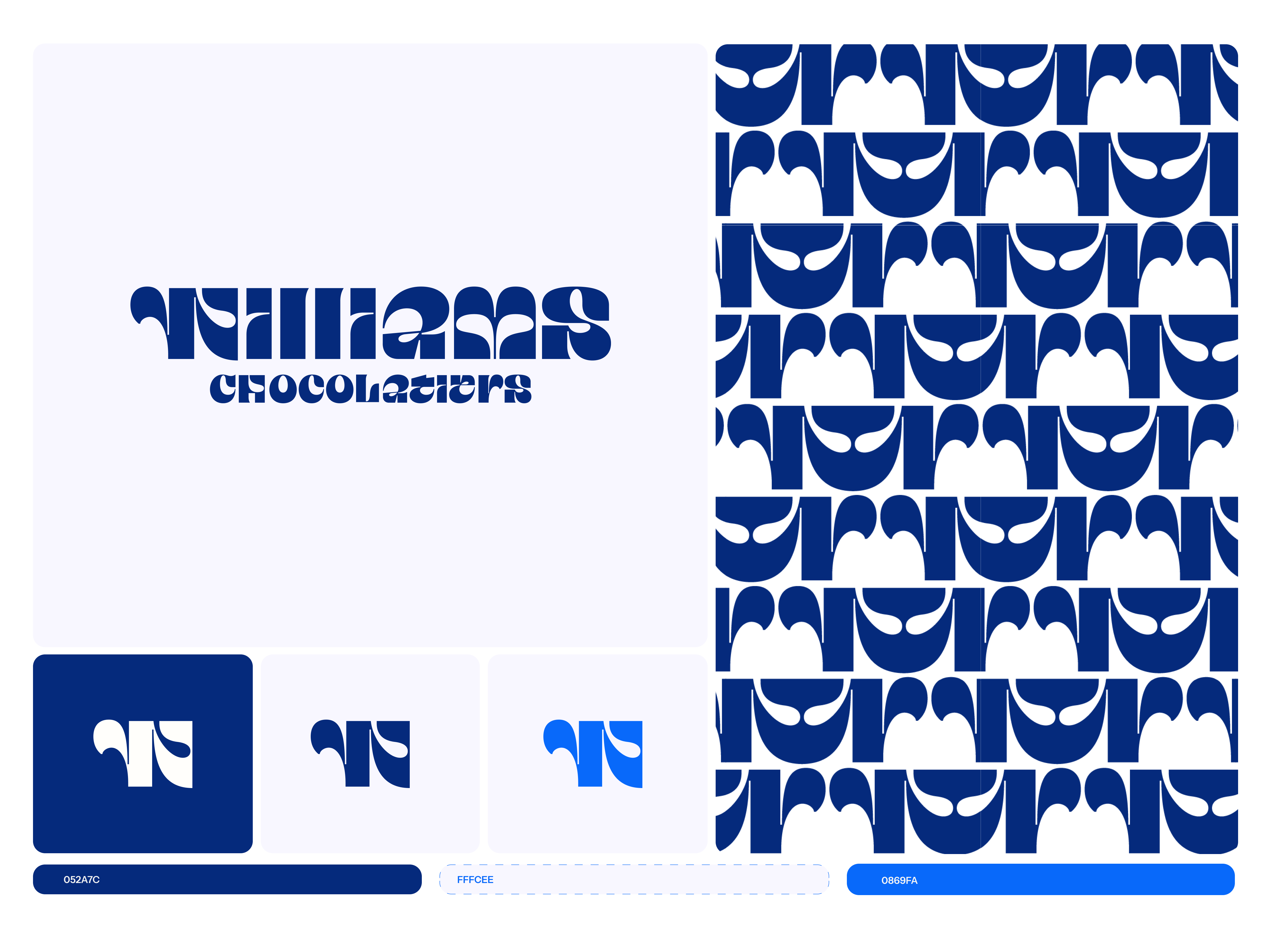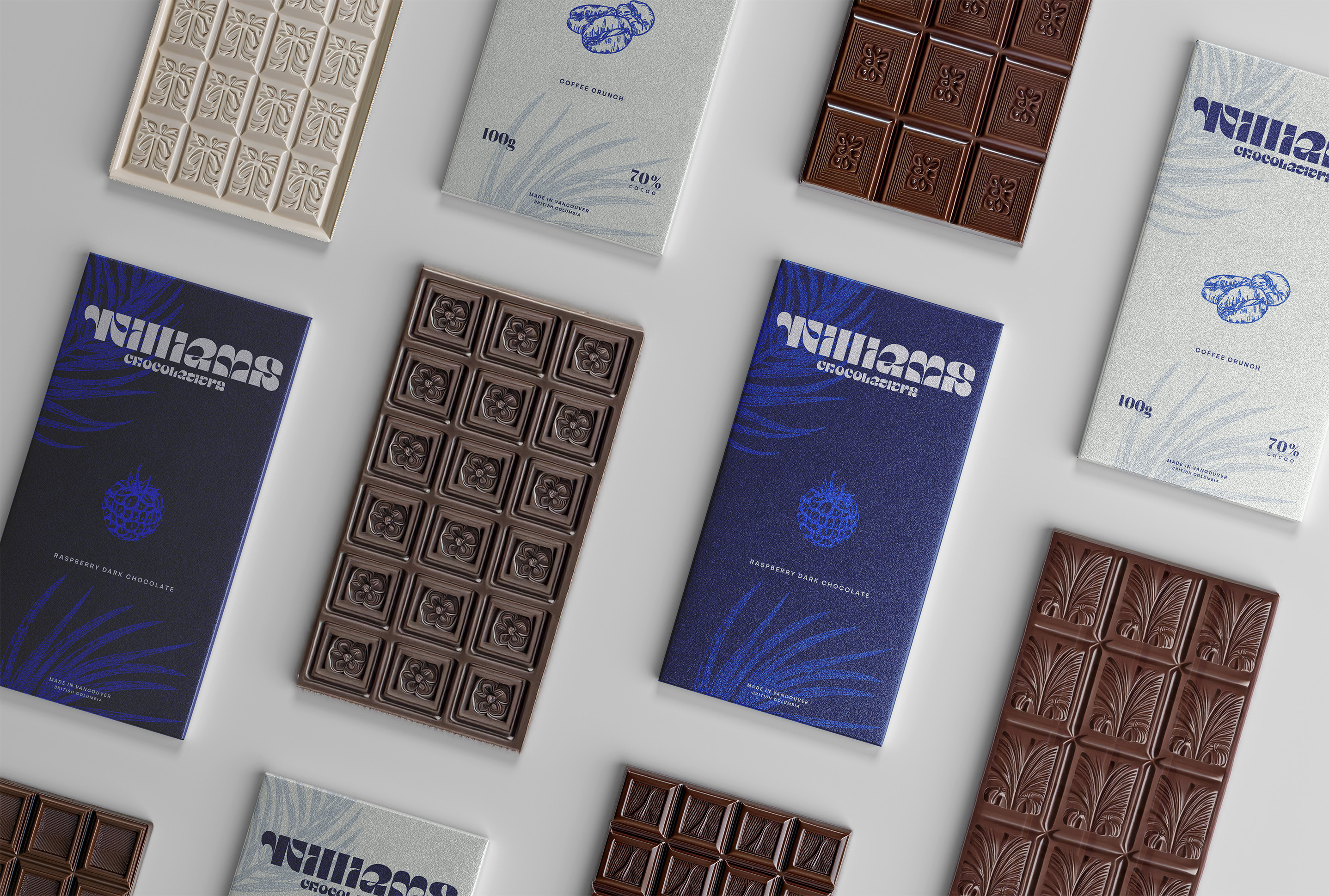 Williams Chocolatier draws inspiration from timeless European confectionery but introduces a contemporary twist. The deep navy grounds the design, off-white adds softness and balance, and royal blue serves as a bold accent giving the brand a fresh, elevated edge that stands out from conventional chocolate packaging.